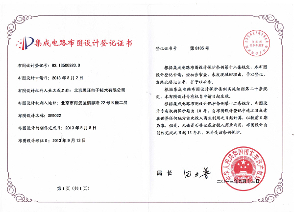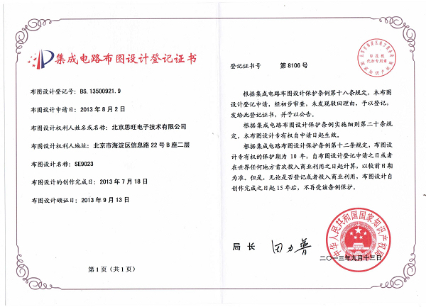 高高涨庆贺司结果SE9022、SE9023、SE9175 达到我国小知识产权证局“集成式电路板布图建议挂号”